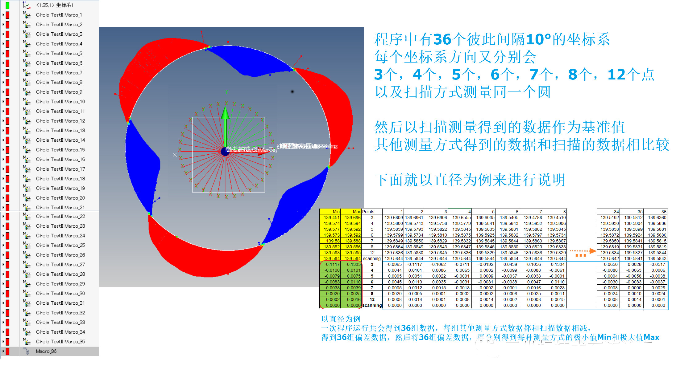 测试方法:定义36个坐标系,坐标系之间夹角为10°,每个坐标系下又分别使用3个,4个,5个,6个,7个,8个,12个点以及扫描方式测量同一个圆。每个方向上“3个,4个,5个,6个,7个,8个,12个点分别和对应方向上扫描方式测量结果进行比较。