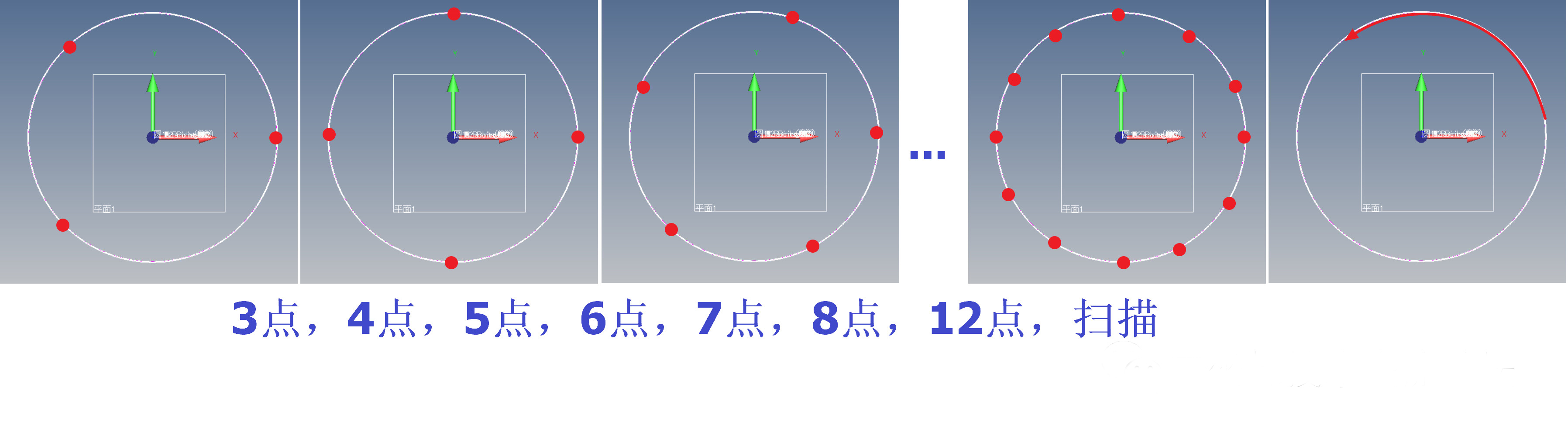 第一种理解是在没有第二旋转轴约束情况下 ,测量一个圆,3点,4 点,7点或更多的点,得到的直径,圆心会有不同