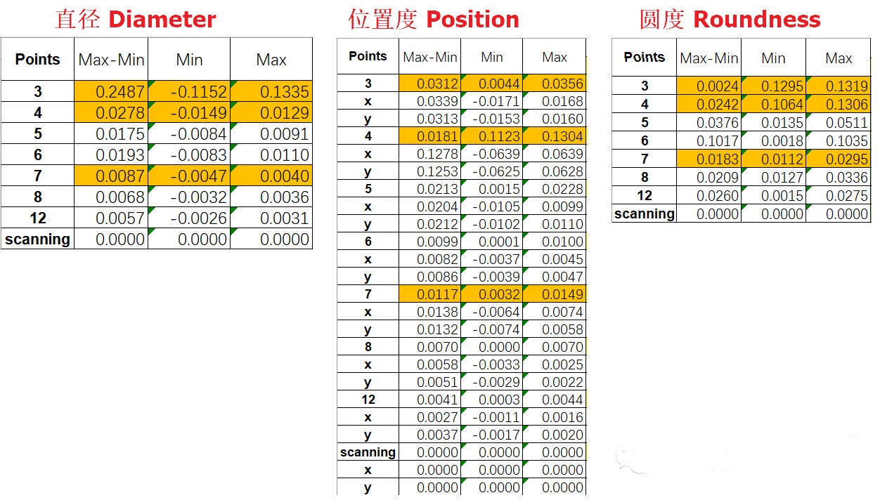 评价位置度,6点或7点以下数据存在较大波动,8点以及以上点数时的数据波动性小。圆度扫描测量数据波动最小,最稳定。
